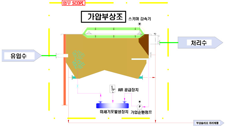 - 응집조, 반응조, 가압부상조의 일체형으로 협소한 공간 전체 설비 설치 가능